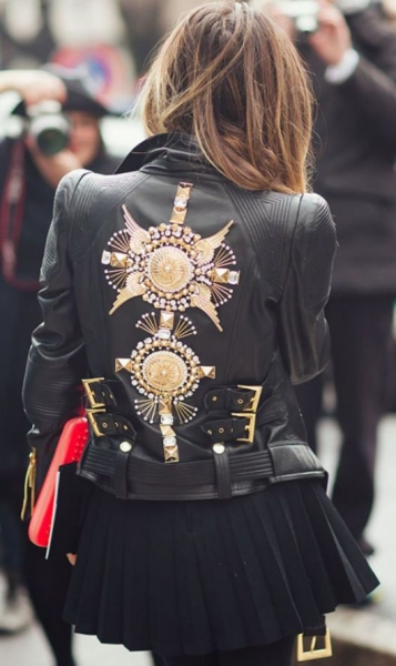 Наличие пайеток, страз и кристаллов не является обязательным, но приветствуется. Они необходимы для большего контраста с грубой кожей, украшенной металлическим декором – шипами, пряжками, заклёпками, цепочками. В фасонах изделий присутствуют накладные карманы, заметные швы, шнуровка, драпировка, косые молнии.