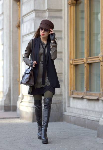- Лёгкий повседневный urban комплект из облегающей кофты с круглым вырезом, кожаной короткой юбки, чёрных колготок и ботинок. В качестве аксессуара выступает бордовая кроссбоди и широкополая шляпа.