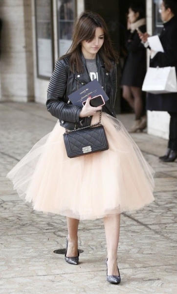 Образ можно дополнить легким приталенным пиджаком или , а также не забывайте про обувь: желательно, чтобы она была на каблуке или танкетке, к примеру, черные ботильоны или полусапожки, украшенные цепочками, клепками или другой гранж-драпировкой.