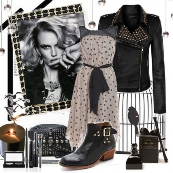 - Вечернюю комбинацию можно составить с помощью длинного летящего платья с вырезами и кружевными вставками, кожаной куртки с бахромой и замшевых сапожек. Яркий смоки айс, шипастый ошейник и браслеты на руках завершат наряд.