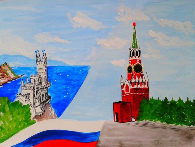 Что мы Родиной зовём? Всё, что в сердце бережём, И под небом синим-синим Флаг России над Кремлём.