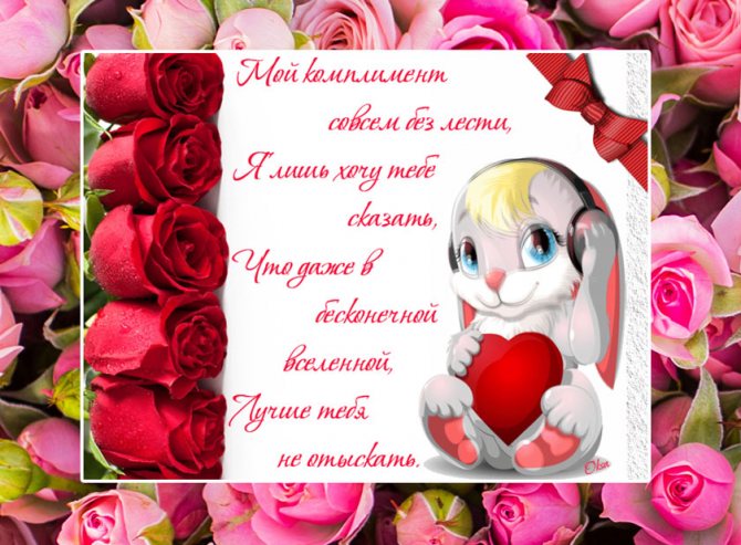 «Дорогая моя подруга! Ты невероятно чистый и искренний человек. Ты может заполнить сердце любого человека любовью и самыми светлыми эмоциями. Ты всегда искренна, честна и миролюбива. С тобой никогда не бывает скучно, ты умеешь создать нужную атмосферу. А еще ты всегда просто сногсшибательно выглядишь! И как настоящая подруга всегда придешь на помощь и никогда не бросишь в беде. Спасибо тебе за все! Ты лучшая! Лучшая во всем, помни об этом!».