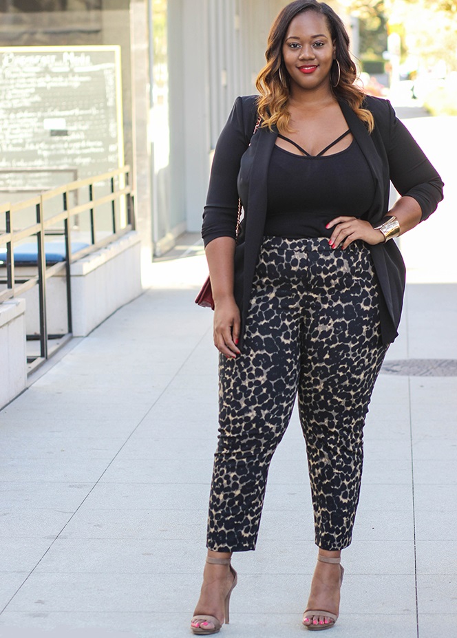 В классическом черном костюме пышка выглядит изящно и элегантно.
