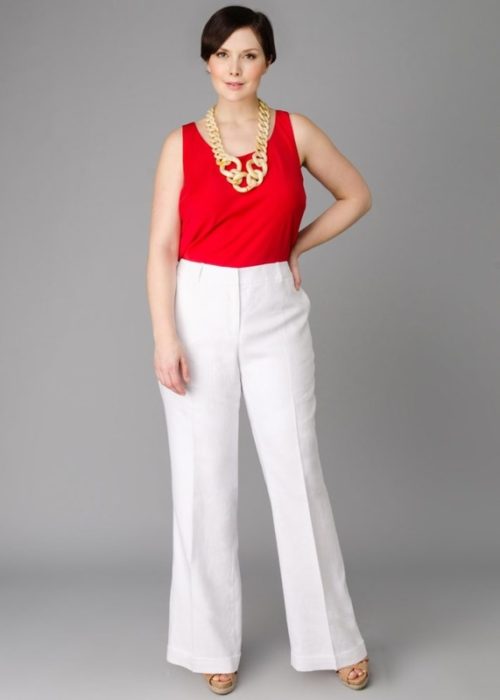 - В брючном костюме барышня с лишними килограммами выглядит стройнее. Длина брюк – до середины каблука. Как и юбки, они должны быть прямыми или слегка расширенными от щиколотки.