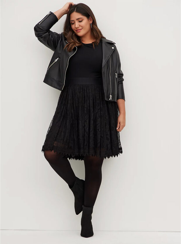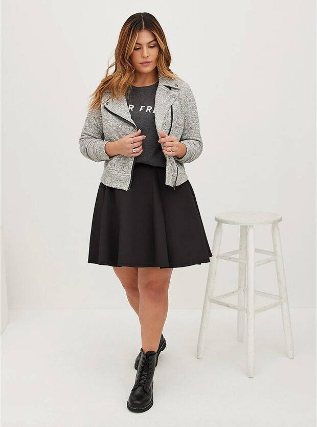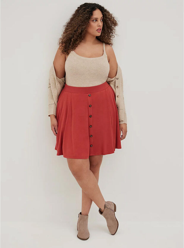 2. Расклешенная юбка украсит полную фигуру и придаст элегантности. Она прекрасно будет смотреться с широким массивным поясом, туфлями на каблуке и укороченным жакетом. Длина – до середины колена.