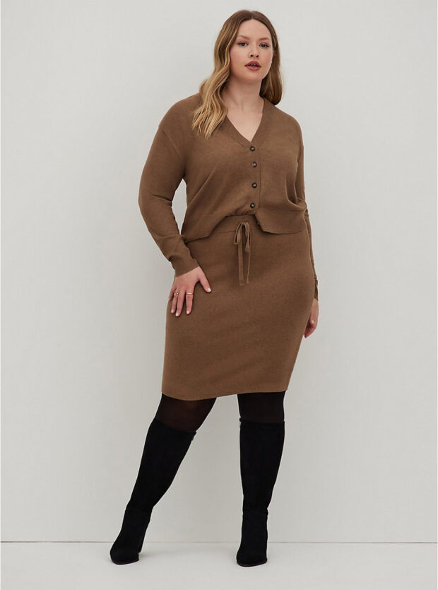 - Если пышка хочет скрыть животик, она может купить очень женственный костюм с платьем с завышенной талией. Конечно же, если носить такой позволяет офисный дресс-код.
