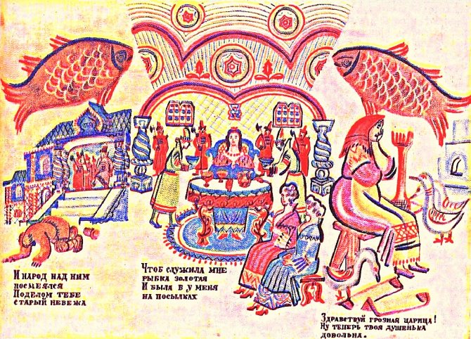 Перед вами очень интересная картинка. Она нарисована так, что мы с вами разом видим и прошлое, и настоящее, и будущее жадной старухи: вот бедна она, вот она царица, и слуги гонят взашей старика. Но летит слева и справа золотая рыбка. Это намек. Означает он, что мы с вами в сказке и что сказка вся впереди, и погоди, злая старуха, рано радуешься! И непомерная сравнительно с людьми величина рыбки тоже намек: мы ведь имеем дело с волшебной рыбкой, которая все может.