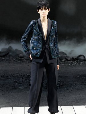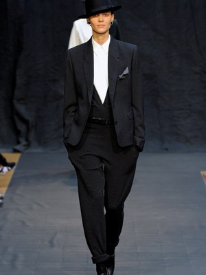 Основная деталь, отличающая костюм в мужском стиле от классического женского костюма, это жилет под пиджаком. Для женской классики более характерны сочетания жакета с брюками или юбкой, жилет входит в моду сравнительно редко и почти всегда вызывает ассоциации с мужским костюмом.