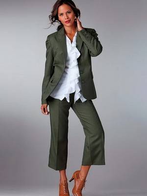 Еще одна заслуга Коко Шанель – женский пиджак мужского кроя навсегда вписался в женский гардероб и занимает одну из лидирующих позиций среди одежды благодаря своей строгости и универсальности. Этот предмет гардероба модно носить с чем угодно, куда угодно и когда угодно. Интересное сочетание черного пиджака мужского кроя будет с белой мужской рубашкой и строгими классическими брюками фисташкового цвета. Гармония цветов, строгий покрой помогут создать красоту и одновременно простоту в костюме