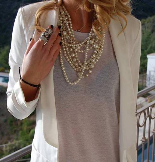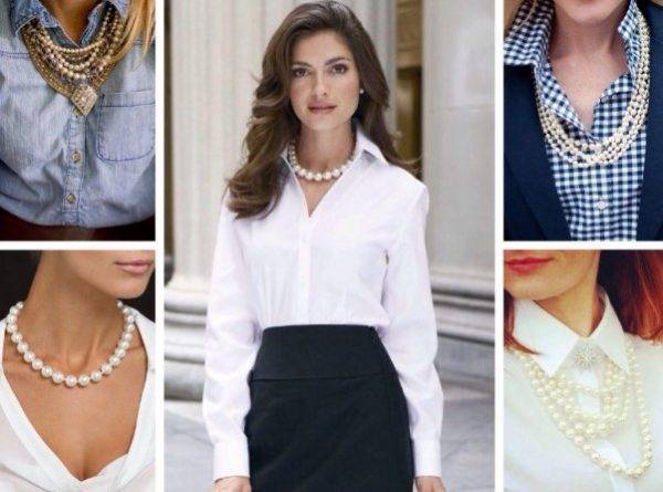 Самый шик – это белая жемчужная нить в паре с белой рубашкой или блузой.