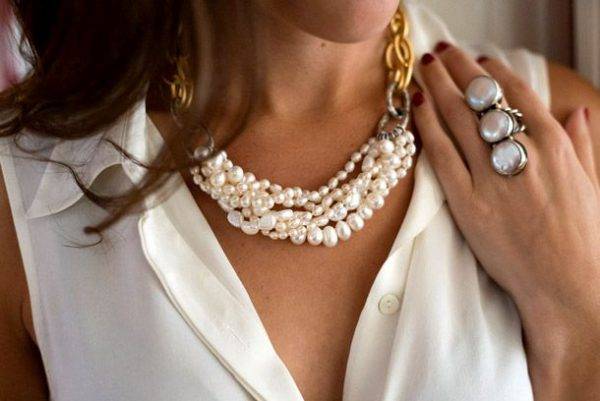 Запомните, что носить жемчуг в повседневной жизни можно с базовыми вещами. Чем сложнее украшение, тем проще должен быть фон для него.