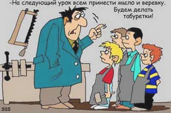 — Мой трудовик был замечательным мужиком — научил работать с ручным инструментом, дал основы электротехники, а ручка для двери, которую я выточил на токарном станке по дереву, до сих пор стоит на двери в сарай у родителей. — А наш торговал на рынке нашими поделками, с картонкой: “Творчество детей-инвалидов с задержкой умственного развития”. От учителя физики Вася узнал, что Земля вертится. А от учителя труда — на чём именно она вертится. Учительница этики попала молотком себе по пальцу и на полчаса стала учителем труда. Учитель труда Федор Степанович уронил на ногу зубило и громко позвал женщину без моральных принципов. Трудовик все время заставлял нас в школе делать скворечники, словно он был в сговоре со скворцами и продавал им жилплощадь в ипотеку. Трудовик говорит ученику: — Сидоров, ты чего в розетку полез? Хочешь, чтобы тебя, как Тутанхамона, перебинтовали?