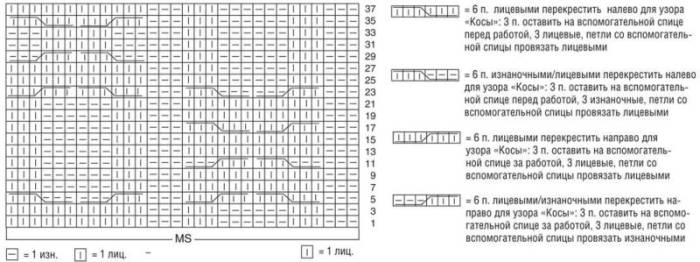 - Петли рукавов вязать лицевыми. Петли переда и спинки по схеме А3 для кос, чередуя с изнаночными петлями.