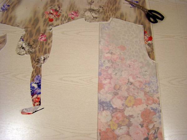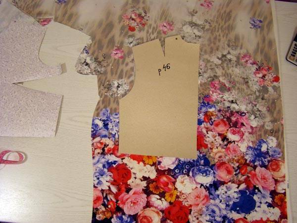 От низа ткани вверх откладываем длину туники и раскладываем лекала полочки и спинки, подгоняя рисунок в наиболее выгодных местах.
