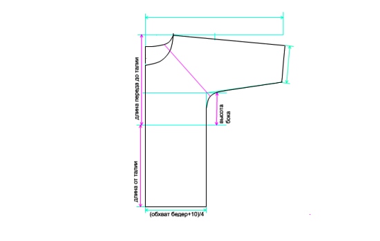 - От линии плеча откладывается пройма — четверть мерки линии бедер;